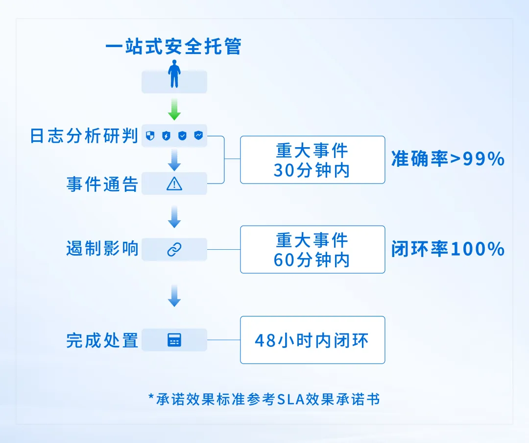 区别传统“买设备+买运维+买服务”的建设模式,安全托管一套方案即可直接购买安全效果,全订阅式交付,部署时间快,适配高速发展、快速扩张中的企业,让安全防护跑在黑客攻击之前,让安全响应跑在业务损失之前。