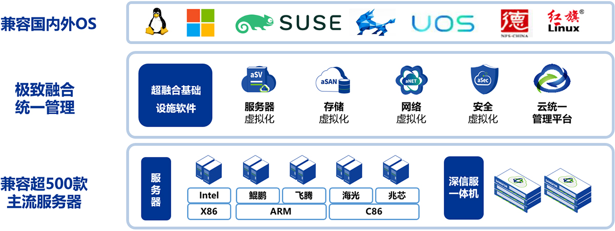 超融合软件由计算虚拟化aSV、存储虚拟化aSAN、网络虚拟化aNET、安全虚拟化aSEC组成,以搭建在超融合平台之上的云管理平台承载多HCI集群的管理运维工作,提供可靠中心、安全中心、监控中心、纳管第三方资源等高级运维功能,具备稳定可靠、性能优异、安全有效、智能便捷的特点。同时,超融合软件原生适配的X86和ARM底层架构进一步提供向自主创新持续演进的能力,可为数字化转型的各类系统、平台以及数据中心建设提供先进的、软件定义的基础设施方案。